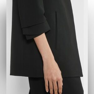 This sleek black blazer from H&M features a minimalist collarless design with a V-neck opening and 3/4 length sleeves. Its tailored silhouette and open front create a sophisticated look, perfect for both formal and casual occasions.