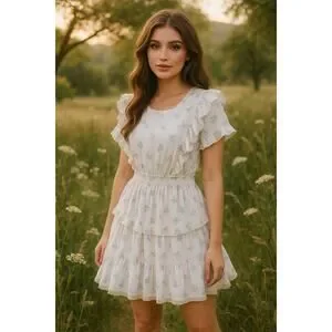 * shabby chic dress, floral mini dress, cottagecore outfit, romantic ruffle dress, boho summer dress, feminine tiered dress, lace trim, vintage-inspired, prairie girl style, picnic dress, spring outfit, XS smocked waist, garden party, soft girl aesthetic, fairytale style, whimsy fashion