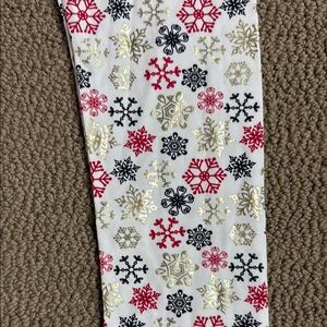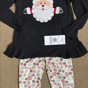 Charming black Santa top featuring a vibrant red bow with a gold center with snowflake pants. Ideal for festive occasions. New!