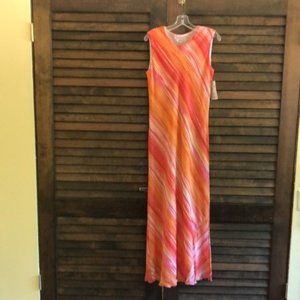 Shades of Orange, pink, and yellow. Cut on the bias for a body flattering stripe.