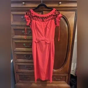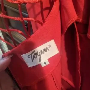 Elegant red dress by Tatyana. Features a lattice neckline and fitted silhouette. Perfect for a classic look.