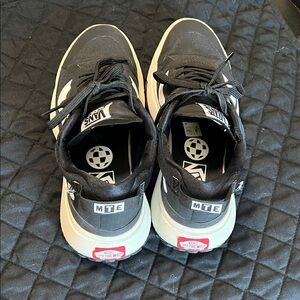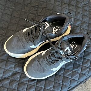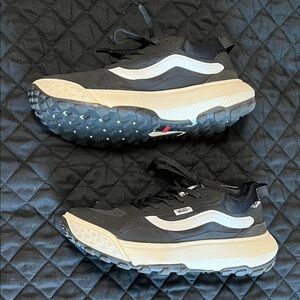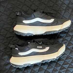 Experience the timeless appeal of Vans with these black and white sneakers, designed for both style and comfort. Featuring a low-top silhouette and the iconic Vans side stripe, these shoes are perfect for skateboarding or casual wear. The durable construction ensures long-lasting wear, while the classic color scheme complements any outfit. Great condition. Wore a few times for work.