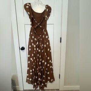 Chic and stylish brown polka dot maxi dress perfect for any occasion. Features a flattering fit and elegant design.