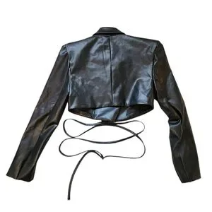 Elevate your style with this sleek black cropped leather jacket. Perfect for any occasion, it offers a chic and modern look.