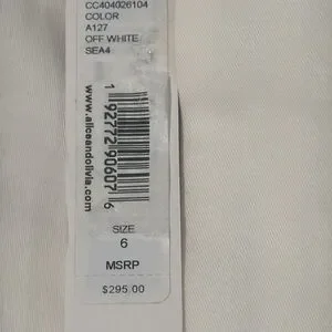NWT Alice + Olivia low rise crop flare pants is an off white color. Low rise, flared crop leg, hidden hook and zip front closure. Lyocell/cotton/elastane material. Ladies size 6.
