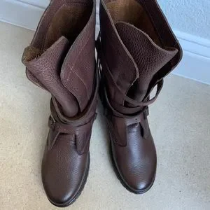 Steve Madden leather boot. Worn 4 times. Nice comfortable boots but wanted a lighter color for my wardrobe. (Won’t be shipped in shoe box)