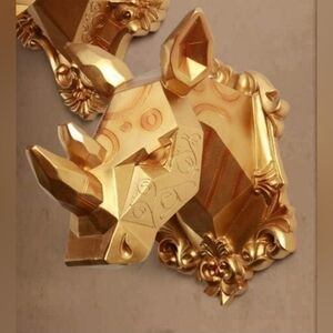 Perfect for luxury-themed interiors, accent walls, or artistic spaces! This unique rhinoceros head is framed with an elegant baroque-style garland and finished in a metallic gold tone for maximum visual impact.