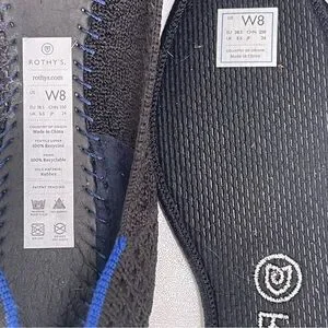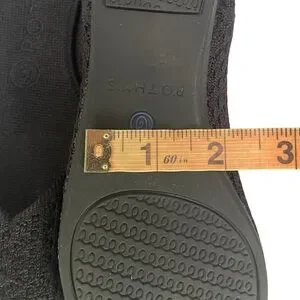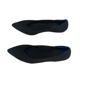 These Rothy's flats showcase a refined pointed-toe design in a sleek black hue, embodying minimalist elegance. The low-cut vamp and clean lines create a sophisticated silhouette, while the dark navy blue lining adds a touch of contrast. Ideal for any occasion, these flats offer both style and comfort.