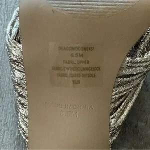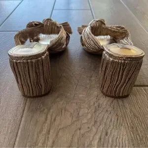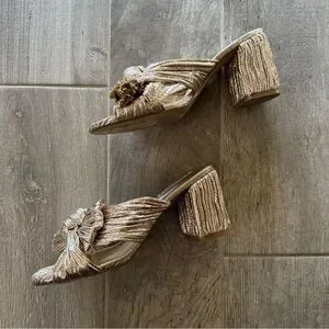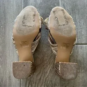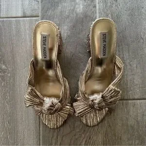 Steve Madden Deacon Knot Block Heel Slide Sandals in Metallic Gold. Puckered, crinkled fabric brings modern texture to a party-ready sandal shaped with a wrapped column heel and an artfully knotted bow over the toe.
