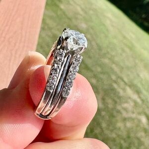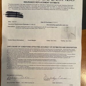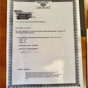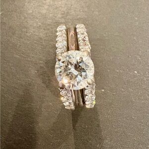 0ne lady’s ring made of 14 karay white gold weighing approximately 3.2 grams & containing a 1.34 karat white diamond, color H, clarity 11, $6500, and band 14 karat white gold insert style wedding band with 26 round shaped diamonds totaling approximately 3/4ct, estimated at &1,999. Well maintained at Helzberg Diamonds, all diamonds in tact, just divorced. Approximately size 7.