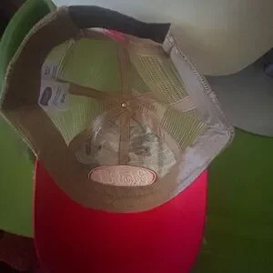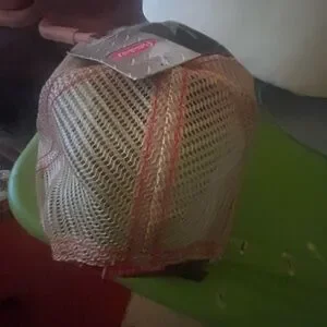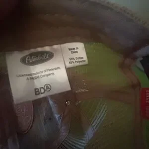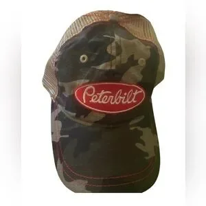 Peterbilt cap with camo pattern and mesh back. Features red logo embroidery.