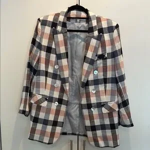 Chic checkered blazer by Veronica Beard. Features a blend of blue, pink, and cream tones. Ideal for a sophisticated style.