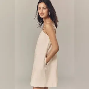 This minimalist mini dress features adjustable, barely there straps, side pockets, and seam detailing – made from a breezy, cool linen blend.