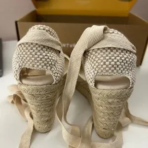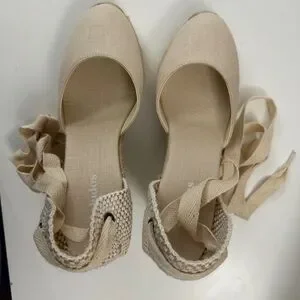 Chic cream espadrille wedges by Soludos. Features woven detailing and comfortable fit. Ideal for casual outings.