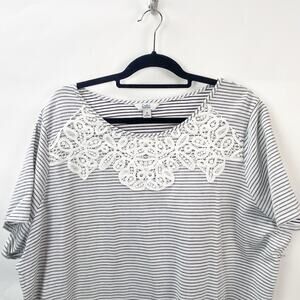 Croft & Barrow 2X Plus Womens White Black Striped Lace Detail Tee Shirt Top