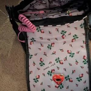 This Betsey Johnson handbag showcases a playful retro phone design with bold black and white stripes. The standout feature is the pink rotary dial on the front, adding a whimsical touch to this stylish accessory. Perfect for those who love a blend of vintage charm and modern flair.