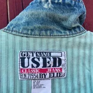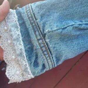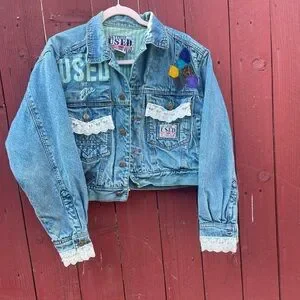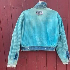 This cropped jean jacket features a stylish blue and white color scheme with a vintage-inspired distressed look. The rolled sleeves and decorative elements add a unique touch, making it a standout piece for casual outings.
