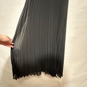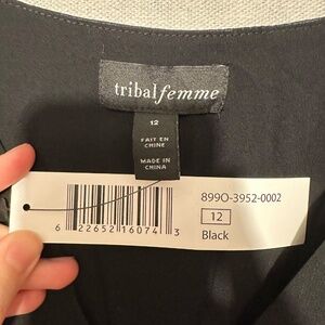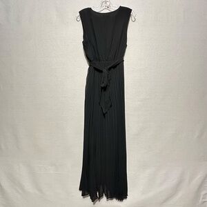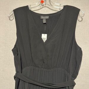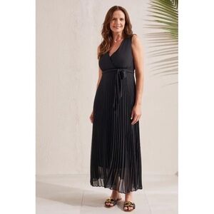 NWT Tribal Femme Lined Plisee Tie Dress in black. From formal gatherings to casual get-togethers, this sleeveless dress fits into any event flawlessly. We're obsessed with the georgette crepe fabric, surplice neckline, empire waist with a ribbon tie, and pleated skirt that reaches the ankle. Lined. Size 12.