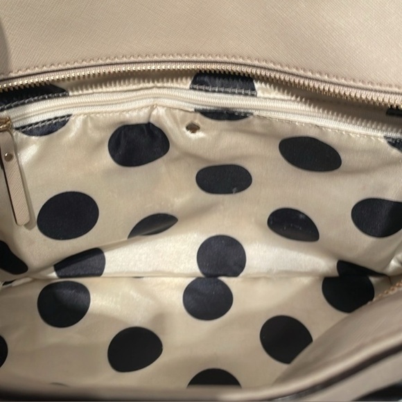 This KATE SPADE Cream Saffiano & Metallic Silver Leather Tote w/Twilly & Dust Bag is in Exceptional Used Condition (EUC): Previously lovingly cared for; but this is a preloved (used) item, some normal and minimal wear is expected; beautiful bone colored large tote with top zip closure, signature polka dot interior that has both zip & slip pockets; wear to one strap in back and minor to one in front. Depending on device used, color may vary. Review pics as they’re part of the description. Sold as is, no refunds. All auction bids/wins are final, no cancellations.