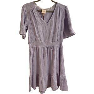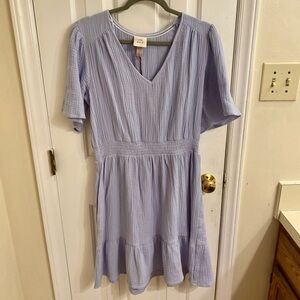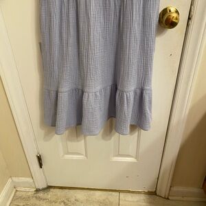 Chic light blue dress with a flattering V-neck and short sleeves. Features a ruffled hem for added style. Brand new with tags from Knox Rose. Lightweight and super comfortable and breezy in a gauze Muslin fabric with stretchy waist and pockets! Size small.