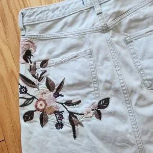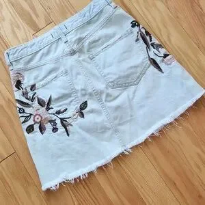 Chic white mini skirt with floral embroidery. Features pink, brown, and blue accents. Frayed hem for a trendy look.