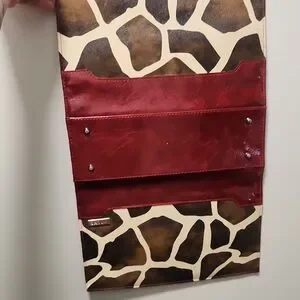 Stylish women's bag featuring a striking red and brown giraffe print design. Perfect for adding a bold touch to any outfit. In good condition!