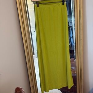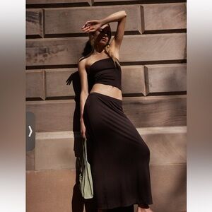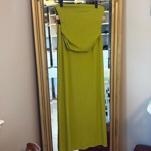 Chic maxi skirt and tube top set by Free People. Green hue adds a stylish touch. Perfect for versatile wear. Tube top and maxi skirt set. Tube top has a sticky part that helps it stay up and a shelf bra. The skirt has never been worn but tags removed. The top worn once. Such a cute summer set. Very soft