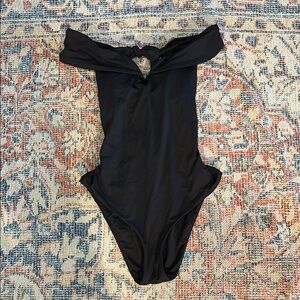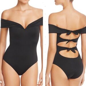 Becca by Rebecca Virtue Socialite Off the Shoulder Bow Back One Piece Swimsuit in Black size small. This swimsuit is new without tags and has never been worn, but it does not have its tags or its hygienic liner anymore unfortunately. The tag has been partially cut as well. New without tags and from a smoke-free home.