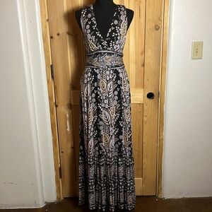 sleeveless design, V-neckline, and pullover closure make it easy to wear and style. Made from a blend of spandex and viscose knit fabric, this dress features a tiered design with layered accents for added flair. The long dress length and lined interior provide both style and comfort, making it a versatile addition to any woman's wardrobe, especially in the summer and spring seasons.