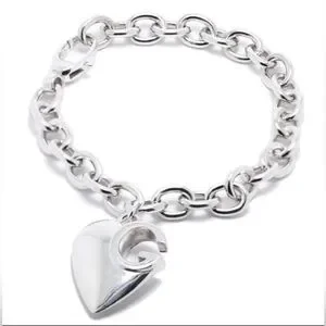 The Gucci Sterling Silver GG design Heart Charm Bracelet is crafted from polished sterling silver in Italy, features a wide set chain style and a heart pendant with a carved out GG detail.