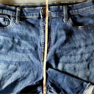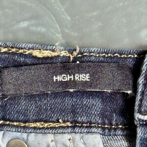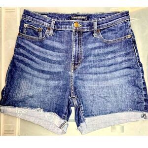 Medium wash, high rise cut offs with raw edges.