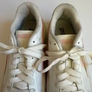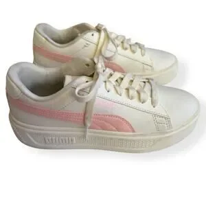 Size Women's 7 Puma Smash V3 Platform Sneakers. Warm White and Rose Dust pink stripe. Super cute sporty leather sneaker with comfortable cushioning and a platform sole. 1" platform, round toe, lace up ties and padded collar. Leather upper and rubber sole. Worn once for an hour. Basically new. No flaws.