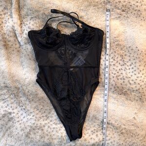 This elegant black lace bodysuit offers a perfect blend of style and comfort. Ideal for intimate wear, it features intricate lace detailing for a sophisticated look. The cups are NOT see through.