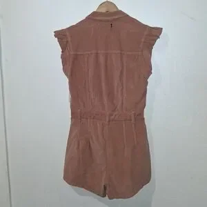 Beautiful "cafe creme" color romper with front zipper. Perfect for casual outings! Easily paired with boots! Belt loops. Ruffle Sleeves.