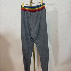Cozy gray track pants. Features rainbow waistband and cuffs. Perfect for casual wear.