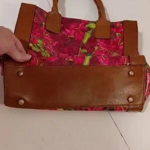 The Patricia Nash tote bag features a striking floral design in pink, accented with rich brown leather trim and handles. Its structured shape and medium size make it an ideal choice for daily use, offering both style and practicality. Great condition with no flaws other than it's missing its shoulder strap