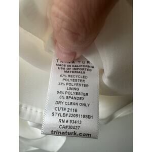 The Trina Turk Women XS Ivory Azalea Stretch Billowy-Sleeve Blouse Top is a stylish and versatile piece perfect for various occasions such as parties, casual outings, or business meetings. Featuring a V-neckline, ruffle accents, and balloon sleeves, this blouse is made of a blended fabric that is lightweight and lined for comfort. The classic ivory color and solid pattern make it a timeless addition to your wardrobe, while the relaxed fit adds a touch of ease and sophistication to your look. Perfect for the summer, fall, or spring seasons, this blouse is a must-have for any fashion-forward woman.