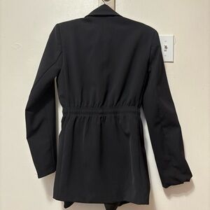 This Athleta trench coat in classic black features a tailored silhouette with a notched lapel collar and a wrap-style design. The belted waist enhances its flattering shape, making it a versatile choice for both professional and casual settings. It’s in a very good condition, just worn once or twice.