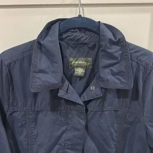 Eddie Bauer navy light weight coat. Button down front with a tailored design. In great shape. See photos for reference.