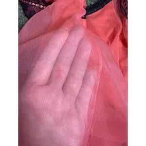 Vintage 1960's Nightie & Brief Panty set from Emillio Pucci. Missing size tag, please see measurements for sizing/fit. Coral chiffon nylon fabric with Black Lace + Coral ribbon accents. A-line "babydoll" dress hits just below the gusset. Brief has high cut waistband + low cut leg. Wide scoop neck. Silky nylon layer at body + Sheer Chiffon layer on top and sleeves. Black lace trim at sleeves and dress hem. In Good condition with small snags front above hem, at upper back, and one 0.5" snag at left waist near side-seam. See last photo and zoom flat photos to see. Please inspect photos to see condition. Shown on 5'11" size 4/6 mannequin. I am a size 8/ Medium and both pieces fit me comfortably. Measurements taken laying flat and doubled where appropriate.