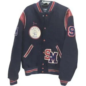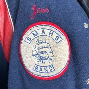 Authentic Holloway Original College Jacket with classic varsity styling. Navy wool body with red leather sleeves and bold SMHS Band / Drumline patches. Custom embroidered name “Jess” makes this a true one-of-a-kind vintage piece.