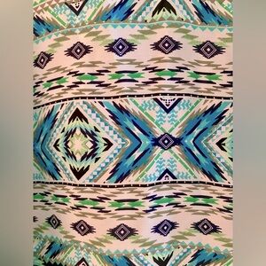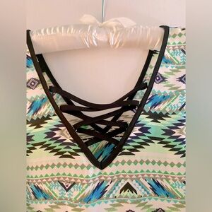This tank has never been worn. It is flowy and has a unique pattern. It is very neck and a cute criss cross pattern. It is light weight and perfect for the summer weather.