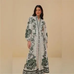 This stunning gown features a vibrant green and white color scheme with an intricate floral print. It is designed with long bishop sleeves and a stylish mandarin collar, making it perfect for resort wear. The floor-length silhouette flows beautifully, offering a relaxed and elegant fit.