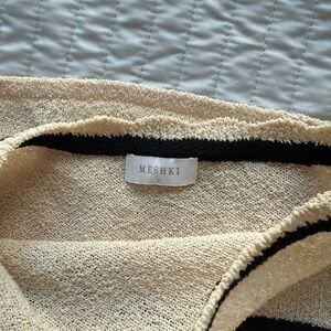 This sophisticated sheath dress by Meshki features a sleek strapless neckline and a form-fitting silhouette, perfect for summer events. The elegant knit is beautifully contrasted by a distinctive black waistband, adding a touch of modern flair to its minimalist design.