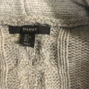 TAHARI Wool blend Long Open Cardigan thick Sweater. SMALL . Measurements: Size S: underarm to underarm 18”, sleeves 24”. Hem 6”. Length 29”. Hem 4”. Size m: underarm to underarm 22”, sleeves 23”, hem 6”, length 27”, hem 4”, size xl: measurements: underarm to underarm 25”, sleeves 26”, hem 6”, length 28”, hem 4”. Pockets. Cable knit on the sleeves . Please note : price for 1 only item sweater . Content: 60% lambswool, 40% nylon ) . Thick - great for winter. Bin 8