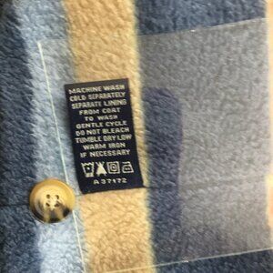 Body lined in soft multicolor striped 100% polyester fleece (blues, tan, red, orange).