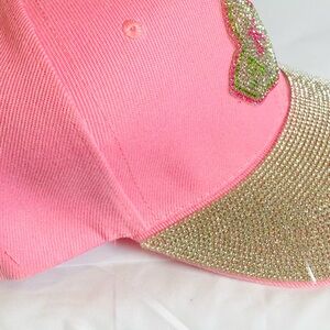 Add a touch of sparkle to your outfit with this pink rhinestone embellished cap. Perfect for casual outings.