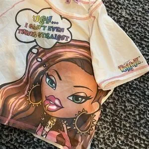 This Dolls Kill x Bratz Pride crop top features a captivating graphic design on a white and pink base, perfect for adding a playful touch to your casual wardrobe. Labeled as a size XL, but fits a M-L
