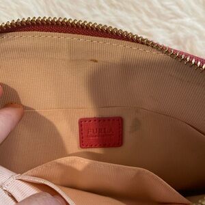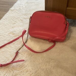 Gorgeous Furla small crossbody bag in a beautiful pink with gold hardware and an adjustable strap.
