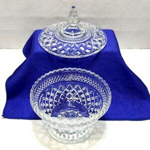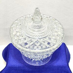 This vintage Anchor Hocking Wexford candy dish showcases a timeless elegance with its intricate crisscross and diamond pattern. Crafted in the late 1960s, it serves as both a functional container for treats and a stunning decorative piece. Its sparkling clear fused glass design embodies mid-century charm and adds sophistication to any setting